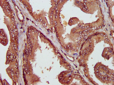 IHC image of CSB-PA06867A0Rb diluted at 1:400 and staining in paraffin-embedded human prostate tissue performed on a Leica BondTM system. After dewaxing and hydration, antigen retrieval was mediated by high pressure in a citrate buffer (pH 6.0). Section was blocked with 10% normal goat serum 30min at RT. Then primary antibody (1% BSA) was incubated at 4°C overnight. The primary is detected by a biotinylated secondary antibody and visualized using an HRP conjugated SP system.