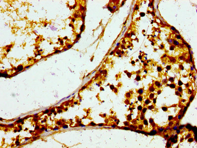 IHC image of CSB-PA06867A0Rb diluted at 1:400 and staining in paraffin-embeddedhuman testis tissue performed on a Leica BondTM system. After dewaxing and hydration, antigen retrieval was mediated by high pressure in a citrate buffer (pH 6.0). Section was blocked with 10% normal goat serum 30min at RT. Then primary antibody (1% BSA) was incubated at 4°C overnight. The primary is detected by a biotinylated secondary antibody and visualized using an HRP conjugated ABC system.