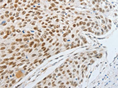 The image on the left is immunohistochemistry of paraffin-embedded Human esophagus cancer tissue using CSB-PA173368(MITF Antibody) at dilution 1/20, on the right is treated with fusion protein. (Original magnification: ×200)