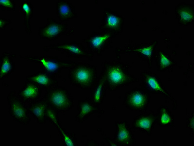 Immunofluorescence staining of SH-SY5Y cells with CSB-PA618752LA01HU at 1:133, counter-stained with DAPI. The cells were fixed in 4% formaldehyde, permeabilized using 0.2% Triton X-100 and blocked in 10% normal Goat Serum. The cells were then incubated with the antibody overnight at 4°C. The secondary antibody was Alexa Fluor 488-congugated AffiniPure Goat Anti-Rabbit IgG(H+L).