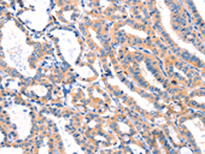 The image on the left is immunohistochemistry of paraffin-embedded Human thyroid cancer tissue using CSB-PA304145(MLLT4 Antibody) at dilution 1/30, on the right is treated with synthetic peptide. (Original magnification: ×200)