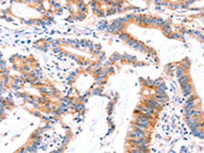 The image on the left is immunohistochemistry of paraffin-embedded Human colon cancer tissue using CSB-PA304145(MLLT4 Antibody) at dilution 1/30, on the right is treated with synthetic peptide. (Original magnification: ×200)