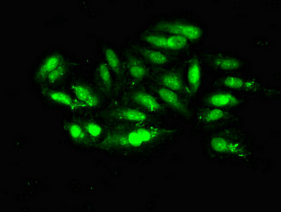 Immunofluorescent analysis of Hela cells using CSB-PA014786EA01HU at dilution of 1:100 and Alexa Fluor 488-congugated AffiniPure Goat Anti-Rabbit IgG(H+L)
