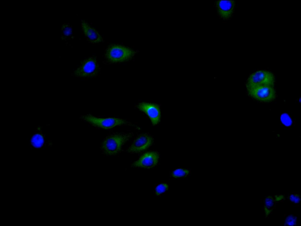 Immunofluorescence staining of Hela cell with CSB-PA839361LA01HU at 1:60, counter-stained with DAPI. The cells were fixed in 4% formaldehyde and blocked in 10% normal Goat Serum. The cells were then incubated with the antibody overnight at 4C. The secondary antibody was Alexa Fluor 488-congugated AffiniPure Goat Anti-Rabbit IgG(H+L).
