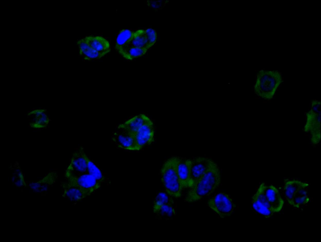 Immunofluorescent analysis of MCF-7 cells using CSB-PA839361LA01HU at dilution of 1:200 and Alexa Fluor 488-congugated AffiniPure Goat Anti-Rabbit IgG(H+L)