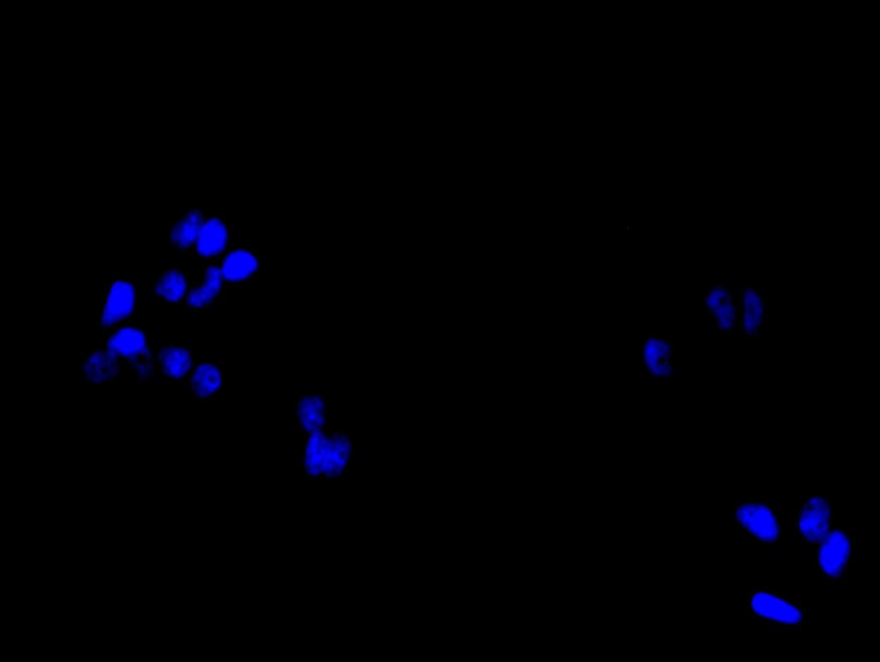 Immunofluorescence staining of Hela cell with 5% goat serum, counter-stained with DAPI. The cells were fixed in 4% formaldehyde and blocked in 10% normal Goat Serum. The cells were then incubated with the antibody overnight at 4C. The secondary antibody was Alexa Fluor 488-congugated AffiniPure Goat Anti-Rabbit IgG(H+L).