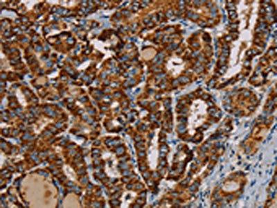 The image on the left is immunohistochemistry of paraffin-embedded Human thyroid cancer tissue using CSB-PA298637(MRPL12 Antibody) at dilution 1/25, on the right is treated with fusion protein. (Original magnification: ×200)