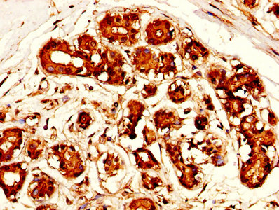 IHC image of CSB-PA10159A0Rb diluted at 1:300 and staining in paraffin-embedded human breast cancer performed on a Leica BondTM system. After dewaxing and hydration, antigen retrieval was mediated by high pressure in a citrate buffer (pH 6.0). Section was blocked with 10% normal goat serum 30min at RT. Then primary antibody (1% BSA) was incubated at 4°C overnight. The primary is detected by a biotinylated secondary antibody and visualized using an HRP conjugated SP system.