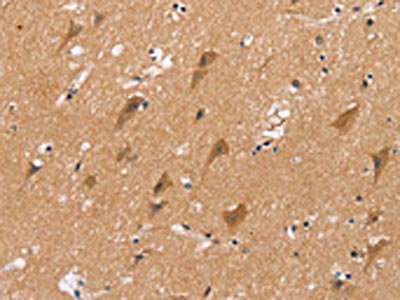 The image on the left is immunohistochemistry of paraffin-embedded Human brain tissue using CSB-PA164416(MSMB Antibody) at dilution 1/20, on the right is treated with fusion protein. (Original magnification: ×200)