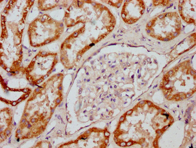 IHC image of CSB-PA015073LA01HU diluted at 1:400 and staining in paraffin-embedded human kidney tissue performed on a Leica BondTM system. After dewaxing and hydration, antigen retrieval was mediated by high pressure in a citrate buffer (pH 6.0). Section was blocked with 10% normal goat serum 30min at RT. Then primary antibody (1% BSA) was incubated at 4°C overnight. The primary is detected by a biotinylated secondary antibody and visualized using an HRP conjugated SP system.