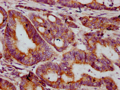 IHC image of CSB-PA015073LA01HU diluted at 1:400 and staining in paraffin-embedded human colon cancer performed on a Leica BondTM system. After dewaxing and hydration, antigen retrieval was mediated by high pressure in a citrate buffer (pH 6.0). Section was blocked with 10% normal goat serum 30min at RT. Then primary antibody (1% BSA) was incubated at 4°C overnight. The primary is detected by a biotinylated secondary antibody and visualized using an HRP conjugated SP system.
