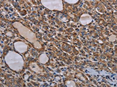 The image on the left is immunohistochemistry of paraffin-embedded Human thyroid cancer tissue using CSB-PA961786(MT-ND6 Antibody) at dilution 1/40, on the right is treated with synthetic peptide. (Original magnification: ×200)