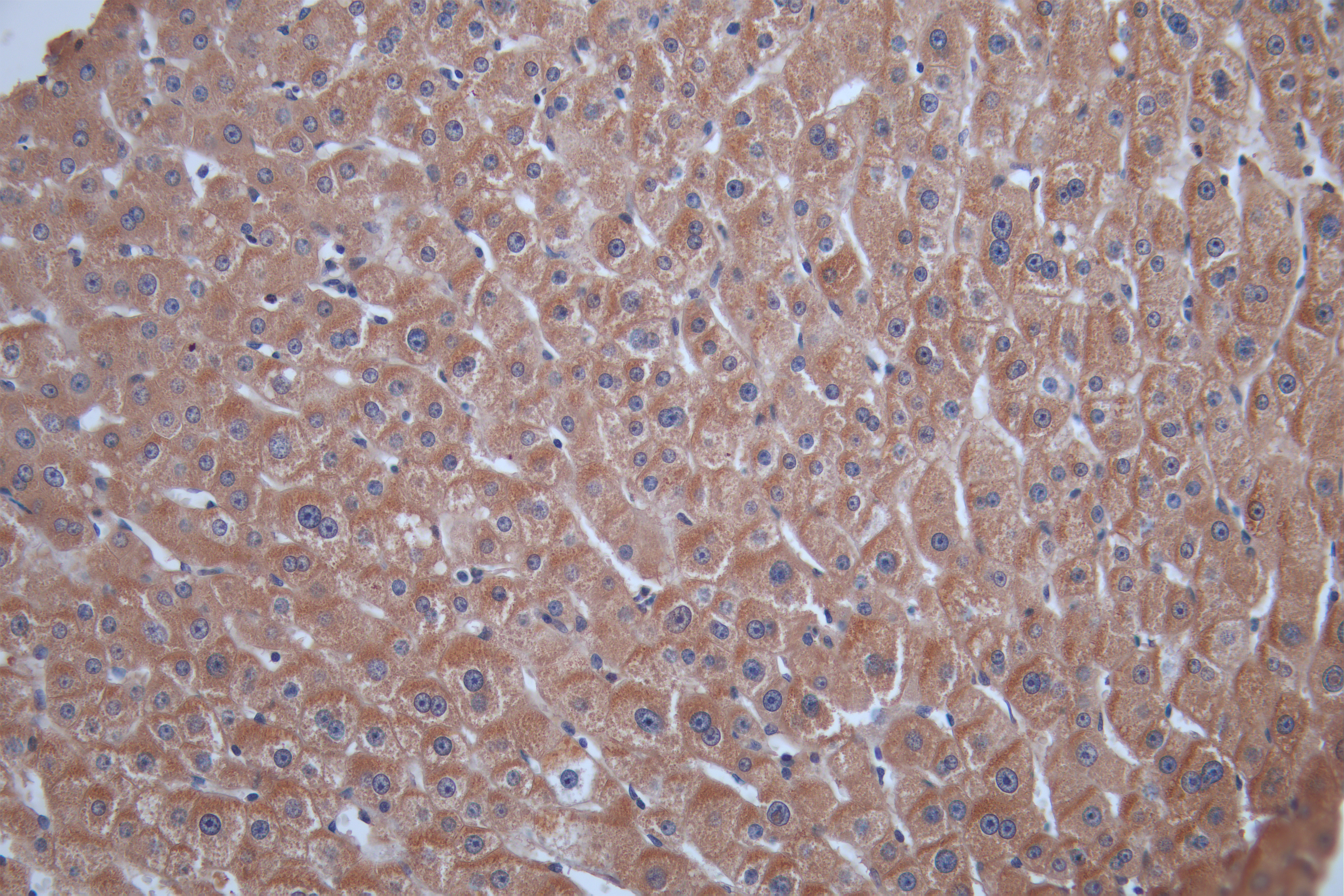 IHC image of CSB-PA17384A0Rb diluted at 1:100 and staining in paraffin-embedded human liver tissue performed on a Leica BondTM system. After dewaxing and hydration, antigen retrieval was mediated by high pressure in a citrate buffer (pH 6.0). Section was blocked with 10% normal goat serum 30min at RT. Then primary antibody (1% BSA) was incubated at 4°C overnight. The primary is detected by a Goat anti-rabbit polymer IgG labeled by HRP and visualized using 0.05% DAB.