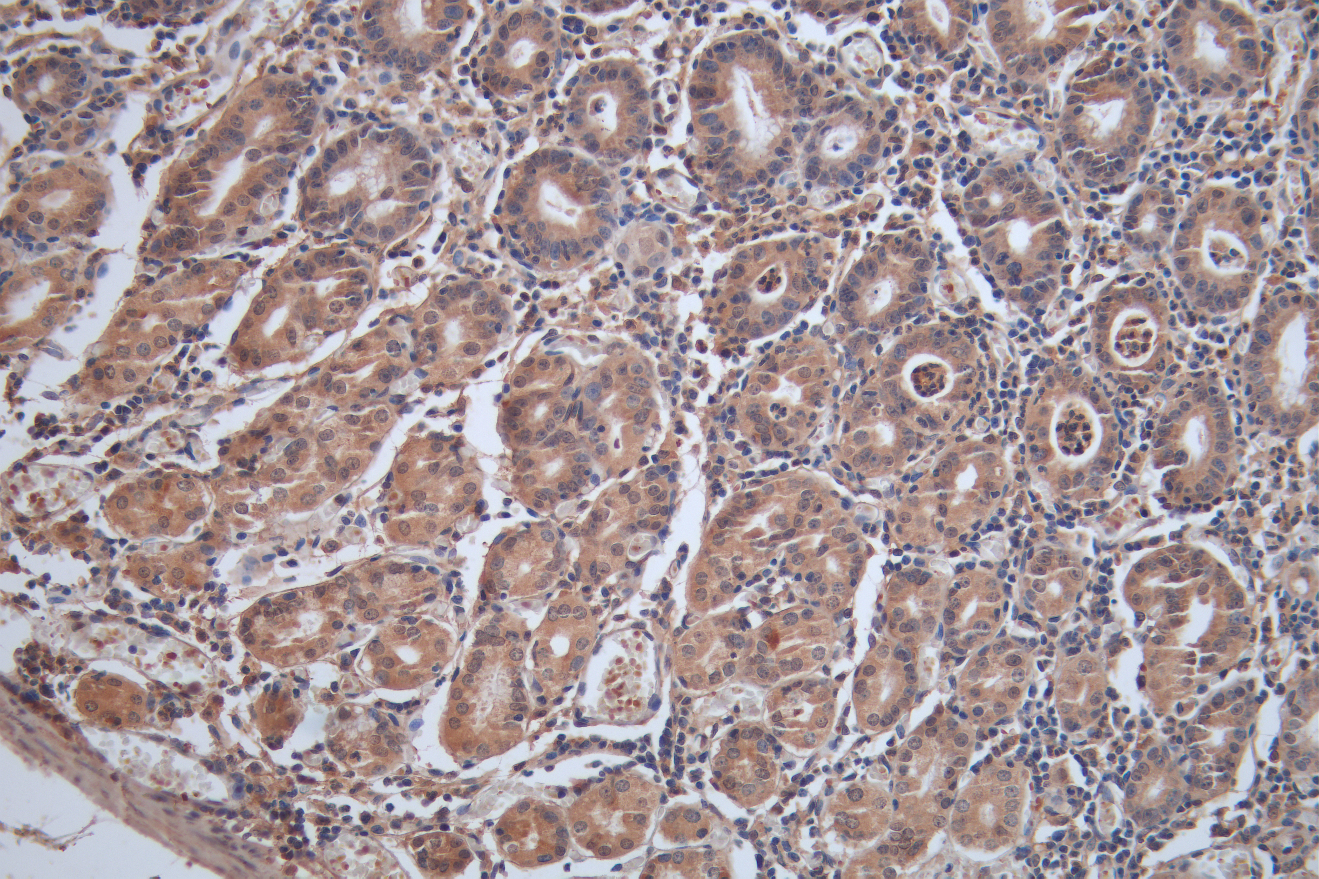 IHC image of CSB-PA17384A0Rb diluted at 1:100 and staining in paraffin-embedded human stomach tissue performed on a Leica BondTM system. After dewaxing and hydration, antigen retrieval was mediated by high pressure in a citrate buffer (pH 6.0). Section was blocked with 10% normal goat serum 30min at RT. Then primary antibody (1% BSA) was incubated at 4°C overnight. The primary is detected by a Goat anti-rabbit polymer IgG labeled by HRP and visualized using 0.05% DAB.