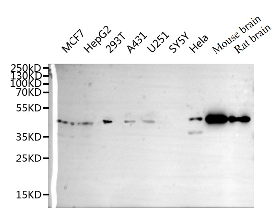 Positive WB detected in: MCF7 whole cell lysate(20μg), HepG2 whole cell lysate(20μg), 293T whole cell lysate(20μg), A431 whole cell lysate(20μg), U251 whole cell lysate(20μg), Hela whole cell lysate(20μg), Mouse brain tissue lysate(20μg), Rat brain tissue lysate(20μg)