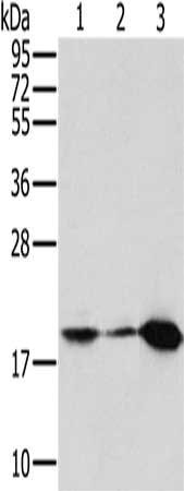 Gel: 10%SDS-PAGE, Lysate: 40 μg, Lane 1-3: Mouse kidney tissue, hela cells, mouse heart tissue, Primary antibody: CSB-PA132736(MTFP1 Antibody) at dilution 1/200, Secondary antibody: Goat anti rabbit IgG at 1/8000 dilution, Exposure time: 5 seconds