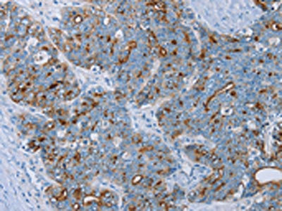 The image on the left is immunohistochemistry of paraffin-embedded Human breast cancer tissue using CSB-PA692815(MUC1 Antibody) at dilution 1/45, on the right is treated with synthetic peptide. (Original magnification: ×200)