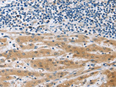 The image on the left is immunohistochemistry of paraffin-embedded Human liver cancer tissue using CSB-PA586381(MUC20 Antibody) at dilution 1/40, on the right is treated with fusion protein. (Original magnification: ×200)