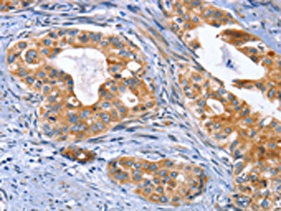 The image on the left is immunohistochemistry of paraffin-embedded Human cervical cancer tissue using CSB-PA579873(MUSK Antibody) at dilution 1/30, on the right is treated with fusion protein. (Original magnification: ×200)