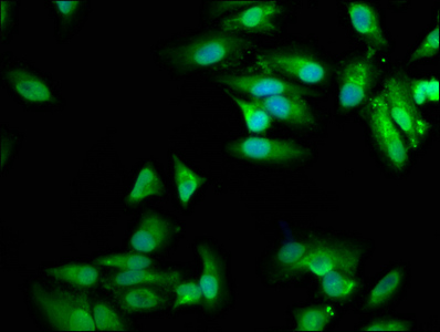 Immunofluorescence staining of Hela cells with CSB-PA015246LA01HU at 1:100, counter-stained with DAPI. The cells were fixed in 4% formaldehyde, permeabilized using 0.2% Triton X-100 and blocked in 10% normal Goat Serum. The cells were then incubated with the antibody overnight at 4°C. The secondary antibody was Alexa Fluor 488-congugated AffiniPure Goat Anti-Rabbit IgG(H+L).