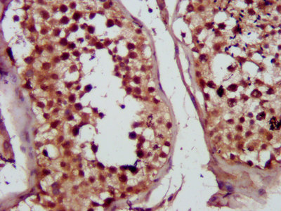 IHC image of CSB-PA015246LA01HU diluted at 1:300 and staining in paraffin-embedded human testis tissue performed on a Leica BondTM system. After dewaxing and hydration, antigen retrieval was mediated by high pressure in a citrate buffer (pH 6.0). Section was blocked with 10% normal goat serum 30min at RT. Then primary antibody (1% BSA) was incubated at 4°C overnight. The primary is detected by a biotinylated secondary antibody and visualized using an HRP conjugated SP system.