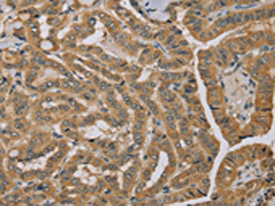 The image on the left is immunohistochemistry of paraffin-embedded Human thyroid cancer tissue using CSB-PA089757(MVK Antibody) at dilution 1/40, on the right is treated with fusion protein. (Original magnification: ×200)