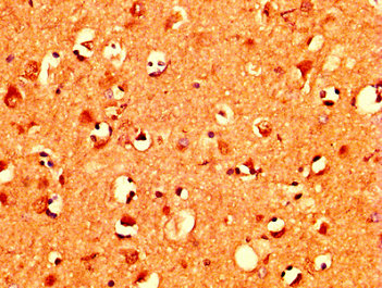 IHC image of CSB-PA015389LA01HU diluted at 1:400 and staining in paraffin-embedded human brain tissue performed on a Leica BondTM system. After dewaxing and hydration, antigen retrieval was mediated by high pressure in a citrate buffer (pH 6.0). Section was blocked with 10% normal goat serum 30min at RT. Then primary antibody (1% BSA) was incubated at 4°C overnight. The primary is detected by a biotinylated secondary antibody and visualized using an HRP conjugated SP system.