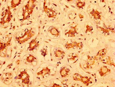 IHC image of CSB-PA015389LA01HU diluted at 1:400 and staining in paraffin-embedded human breast cancer performed on a Leica BondTM system. After dewaxing and hydration, antigen retrieval was mediated by high pressure in a citrate buffer (pH 6.0). Section was blocked with 10% normal goat serum 30min at RT. Then primary antibody (1% BSA) was incubated at 4°C overnight. The primary is detected by a biotinylated secondary antibody and visualized using an HRP conjugated SP system.