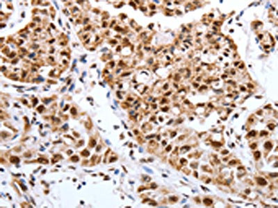 The image on the left is immunohistochemistry of paraffin-embedded Human lung cancer tissue using CSB-PA679670(Map2 Antibody) at dilution 1/40, on the right is treated with synthetic peptide. (Original magnification: ×200)