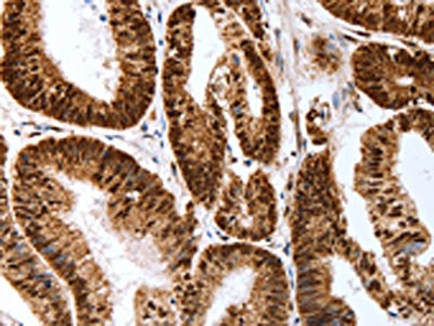 The image on the left is immunohistochemistry of paraffin-embedded Human colon cancer tissue using CSB-PA679670(Map2 Antibody) at dilution 1/40, on the right is treated with synthetic peptide. (Original magnification: ×200)
