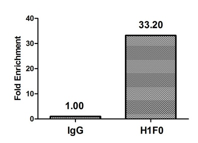 Chromatin Immunoprecipitation Hela (4*106) were treated with Micrococcal Nuclease, sonicated, and immunoprecipitated with 5µg anti-H1F0 (CSB-PA010087OA81me1HU) or a control normal rabbit IgG. The resulting ChIP DNA was quantified using real-time PCR with primers against the β-Globin promoter.