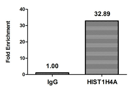 Chromatin Immunoprecipitation Hela (4*106) were treated with Micrococcal Nuclease, sonicated, and immunoprecipitated with 5µg anti-HIST1H4A (CSB-PA010429OA05me1HU) or a control normal rabbit IgG. The resulting ChIP DNA was quantified using real-time PCR with primers against the β-Globin promoter.