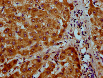 IHC image of CSB-PA22919A0Rb diluted at 1:200 and staining in paraffin-embedded human liver tissue performed on a Leica BondTM system. After dewaxing and hydration, antigen retrieval was mediated by high pressure in a citrate buffer (pH 6.0). Section was blocked with 10% normal goat serum 30min at RT. Then primary antibody (1% BSA) was incubated at 4°C overnight. The primary is detected by a biotinylated secondary antibody and visualized using an HRP conjugated SP system.