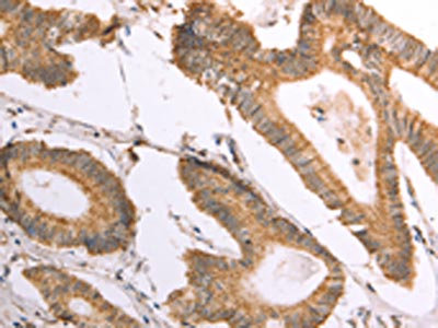 The image on the left is immunohistochemistry of paraffin-embedded Human colon cancer tissue using CSB-PA200625(NAMPT Antibody) at dilution 1/30, on the right is treated with fusion protein. (Original magnification: ×200)