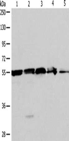 Gel: 10%SDS-PAGE, Lysate: 40 μg, Lane 1-5: A375 cells, 293T cells, mouse liver tissue, Jurkat cells, human fetal kidney tissue, Primary antibody: CSB-PA200625(NAMPT Antibody) at dilution 1/700, Secondary antibody: Goat anti rabbit IgG at 1/8000 dilution, Exposure time: 1 minute