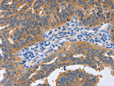 The image on the left is immunohistochemistry of paraffin-embedded Human ovarian cancer tissue using CSB-PA059985(NBEA Antibody) at dilution 1/60, on the right is treated with synthetic peptide. (Original magnification: ×200)