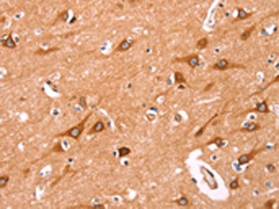 The image on the left is immunohistochemistry of paraffin-embedded Human brain tissue using CSB-PA063661(NCEH1 Antibody) at dilution 1/80, on the right is treated with fusion protein. (Original magnification: ×200)