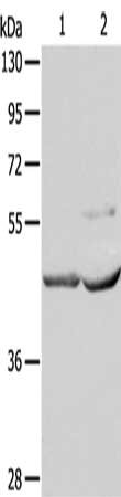Gel: 10%SDS-PAGE, Lysate: 40 μg, Lane 1-2: Mouse kidney tissue, Mouse heart tissue, Primary antibody: CSB-PA063661(NCEH1 Antibody) at dilution 1/1350, Secondary antibody: Goat anti rabbit IgG at 1/8000 dilution, Exposure time: 30 seconds