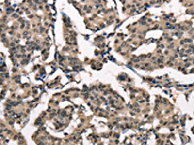 The image on the left is immunohistochemistry of paraffin-embedded Human breast cancer tissue using CSB-PA289915(NDNL2 Antibody) at dilution 1/40, on the right is treated with synthetic peptide. (Original magnification: ×200)