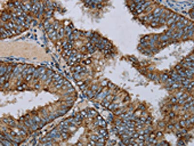 The image on the left is immunohistochemistry of paraffin-embedded Human colon cancer tissue using CSB-PA912628(NDUFA9 Antibody) at dilution 1/30, on the right is treated with fusion protein. (Original magnification: ×200)