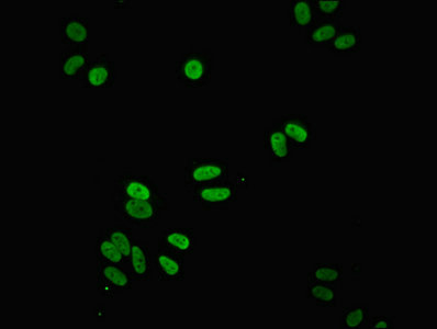 Immunofluorescent analysis of HepG2 cells using CSB-PA015662ESR1HU at dilution of 1:100 and Alexa Fluor 488-congugated AffiniPure Goat Anti-Rabbit IgG(H+L)