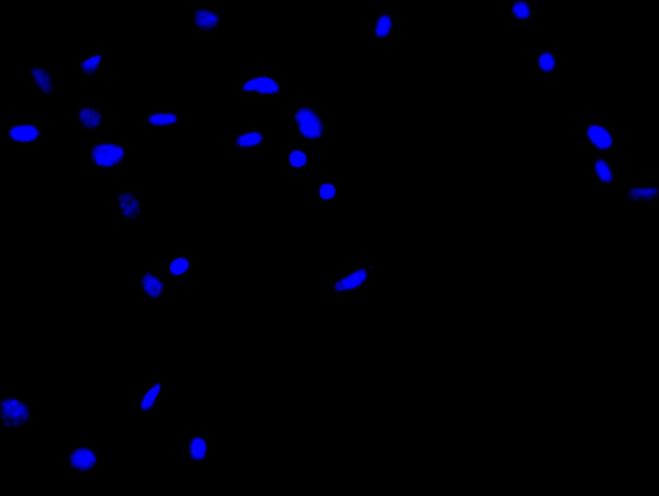 Immunofluorescence staining of NIH/3T3 cell with CSB-PA822274LA01HU at 1:35, counter-stained with DAPI. The cells were fixed in 4% formaldehyde and blocked in 10% normal Goat Serum. The cells were then incubated with the antibody overnight at 4C. The secondary antibody was Alexa Fluor 488-congugated AffiniPure Goat Anti-Rabbit IgG(H+L).