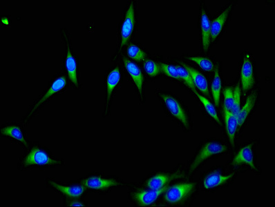 Immunofluorescent analysis of Hela cells using CSB-PA618018ESR1HU at dilution of 1:100 and Alexa Fluor 488-congugated AffiniPure Goat Anti-Rabbit IgG(H+L)