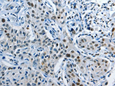 The image on the left is immunohistochemistry of paraffin-embedded Human lung cancer tissue using CSB-PA079753(NEK4 Antibody) at dilution 1/20, on the right is treated with synthetic peptide. (Original magnification: ×200)