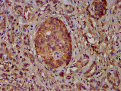 IHC image of CSB-PA740713LA01HU diluted at 1:100 and staining in paraffin-embedded human pancreatic cancer performed on a Leica BondTM system. After dewaxing and hydration, antigen retrieval was mediated by high pressure in a citrate buffer (pH 6.0). Section was blocked with 10% normal goat serum 30min at RT. Then primary antibody (1% BSA) was incubated at 4°C overnight. The primary is detected by a biotinylated secondary antibody and visualized using an HRP conjugated SP system.