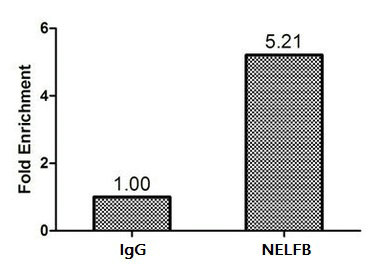 Chromatin Immunoprecipitation Hela (1.1*106) were cross-linked with formaldehyde, sonicated, and immunoprecipitated with 4µg anti-NELFB or a control normal rabbit IgG. The resulting ChIP DNA was quantified using real-time PCR with primers (CSB-PP03765HU) against the TFF1 promoter.