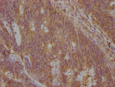 IHC image of CSB-PA892354NA01HU diluted at 1:100 and staining in paraffin-embedded human colon cancer performed on a Leica BondTM system. After dewaxing and hydration, antigen retrieval was mediated by high pressure in a citrate buffer (pH 6.0). Section was blocked with 10% normal goat serum 30min at RT. Then primary antibody (1% BSA) was incubated at 4°C overnight. The primary is detected by a biotinylated secondary antibody and visualized using an HRP conjugated SP system.