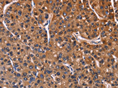 The image on the left is immunohistochemistry of paraffin-embedded Human liver cancer tissue using CSB-PA031193(NFATC3 Antibody) at dilution 1/60, on the right is treated with fusion protein. (Original magnification: ×200)