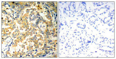 Immunohistochemical analysis of paraffin-embedded human lung carcinoma tissue using NFkB-p100/p52(Ab-872) Antibody(left) or the same antibody preincubated with blocking peptide(right).