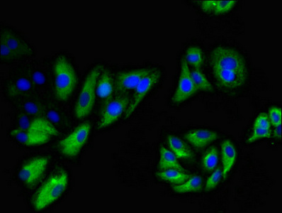 Immunofluorescent analysis of A549 cells using CSB-PA856441LA01HU at dilution of 1:100 and Alexa Fluor 488-congugated AffiniPure Goat Anti-Rabbit IgG(H+L)